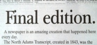 [[Image:Final-edition.jpg|200px|thumb|left|[http://www.berkshireeagle.com//northadamstranscriptfinaledition VIEW FINAL EDITION]]] | |||